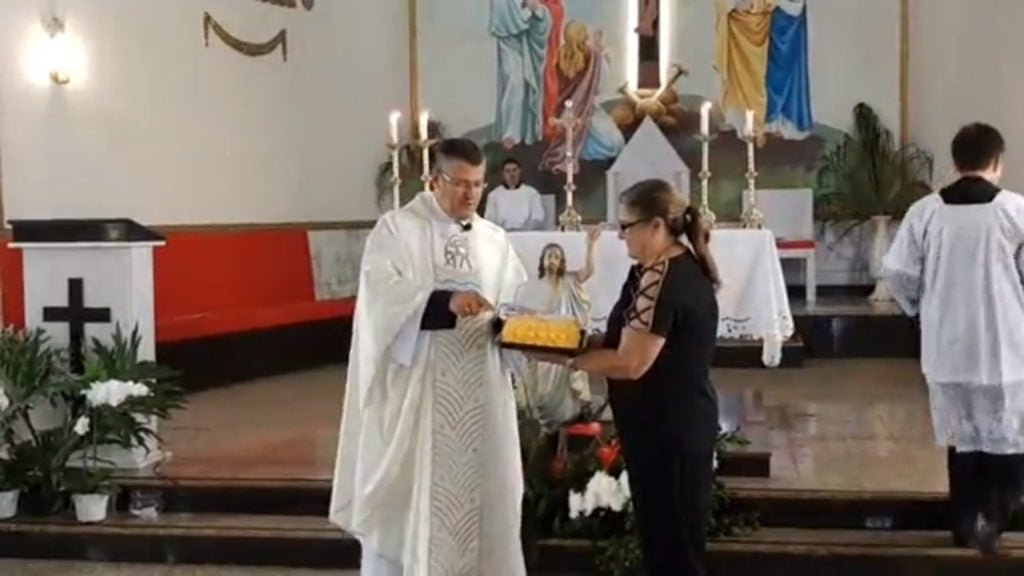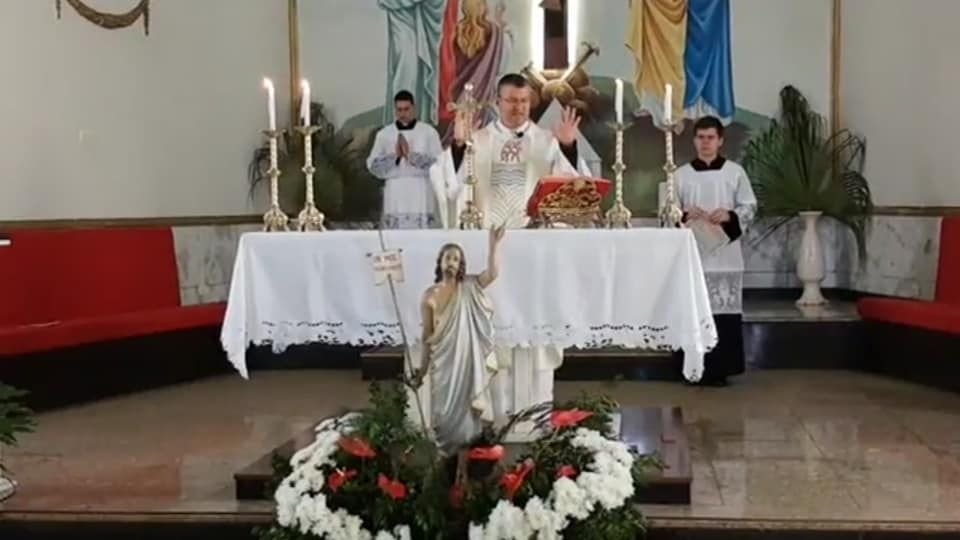Na manhã de domingo (12/04), o padre Marcelo Barreto celebrou a Missa de Páscoa na Matriz da região central de Palmital. Durante a celebração, o pároco cortou o bolo comemorativo aos 95 anos da Paróquia de São Sebastião e subiu com o Santíssimo à sacada da frente da igreja, sobre o átrio da entrada principal, para abençoar a cidade e pedir proteção contra a pandemia.