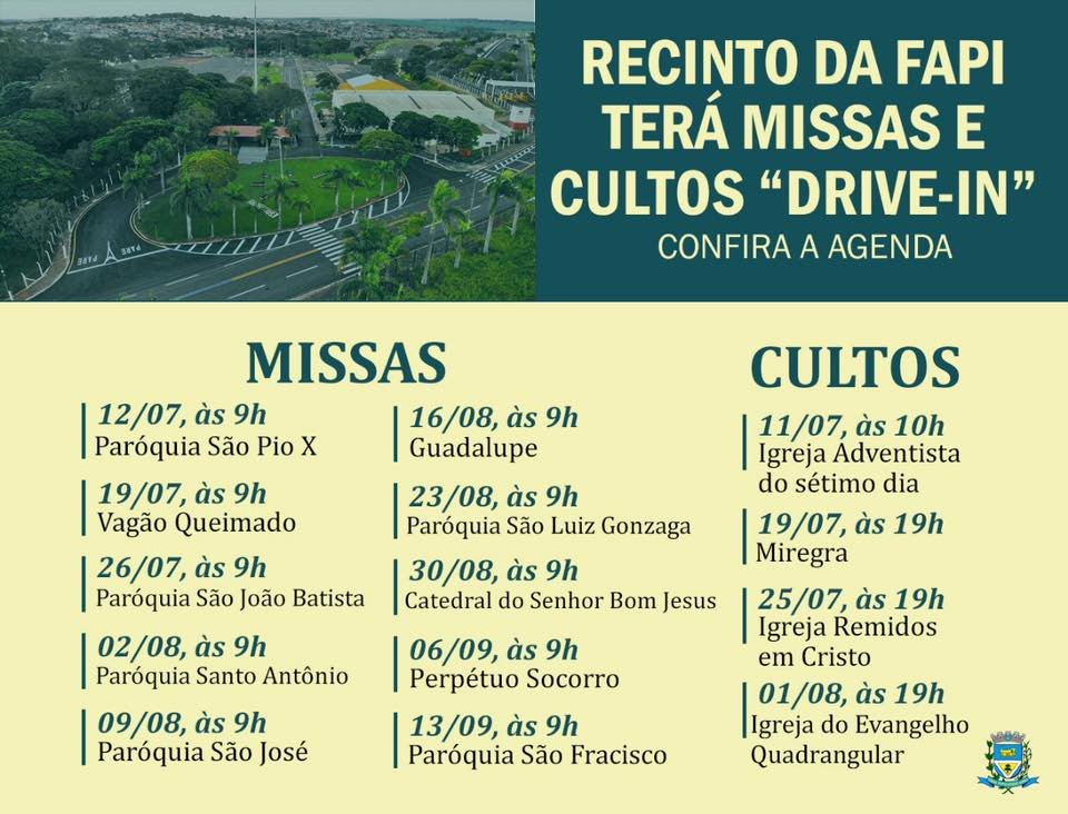 A Prefeitura de Ourinhos anunciou que Igrejas católicas e evangélicas estão autorizadas a promover missas e cultos em sistema “drive-in” (com motoristas e passageiros dentro dos carros), a partir de sábado (11/07), no recinto da Fapi.