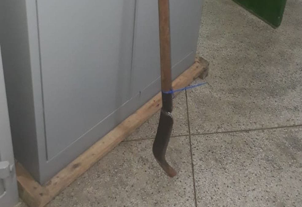 Quando os policiais chegaram nas proximidades do endereço da confusão, já viram o denunciado com uma foice em mãos. Ele estava na rua.