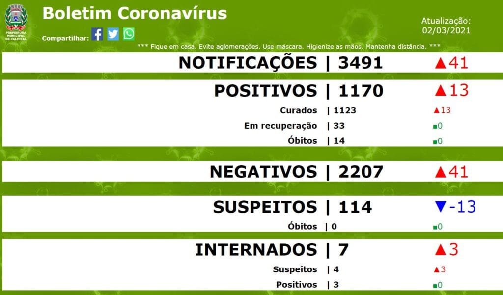 A transmissão do coronavírus voltou a acelerar em Palmital no início desta semana, com o aumento no número de novos casos. Com a soma dos dados divulgados nos boletins epidemiológicos de segunda (01/03) e terça-feira (02/03), foram mais 30 novos casos de coronavírus.