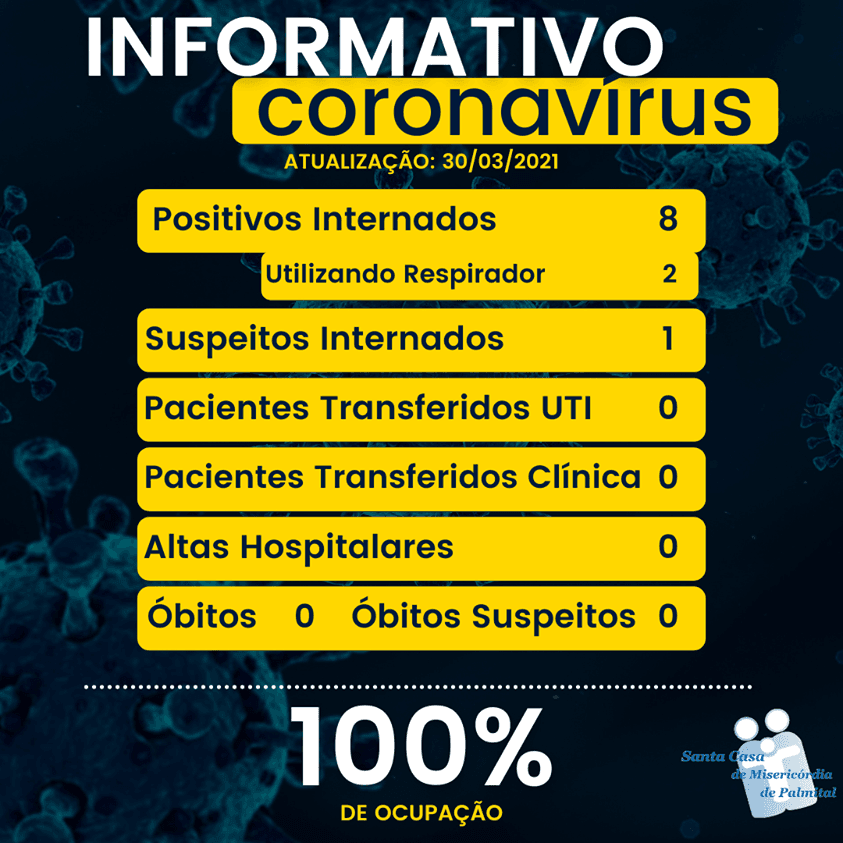 Nesta terça-feira (30/03), a ala de isolamento de Covid-19 da Santa Casa de Misericórdia de Palmital atingiu novamente os 100% de ocupação para pacientes SUS. Oito doentes estão em leitos clínicos, com quadros leves e moderados, e dois são mantidos entubados, com solicitação de vaga em UTI, para a ventilação mecânica devido às condições graves de comprometimento respiratório.