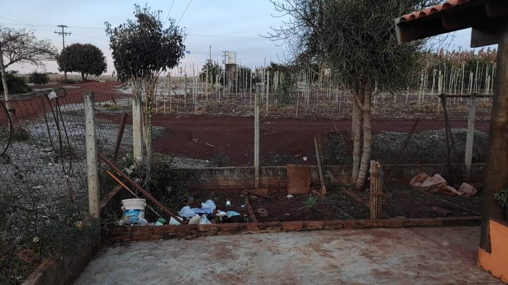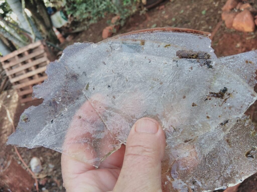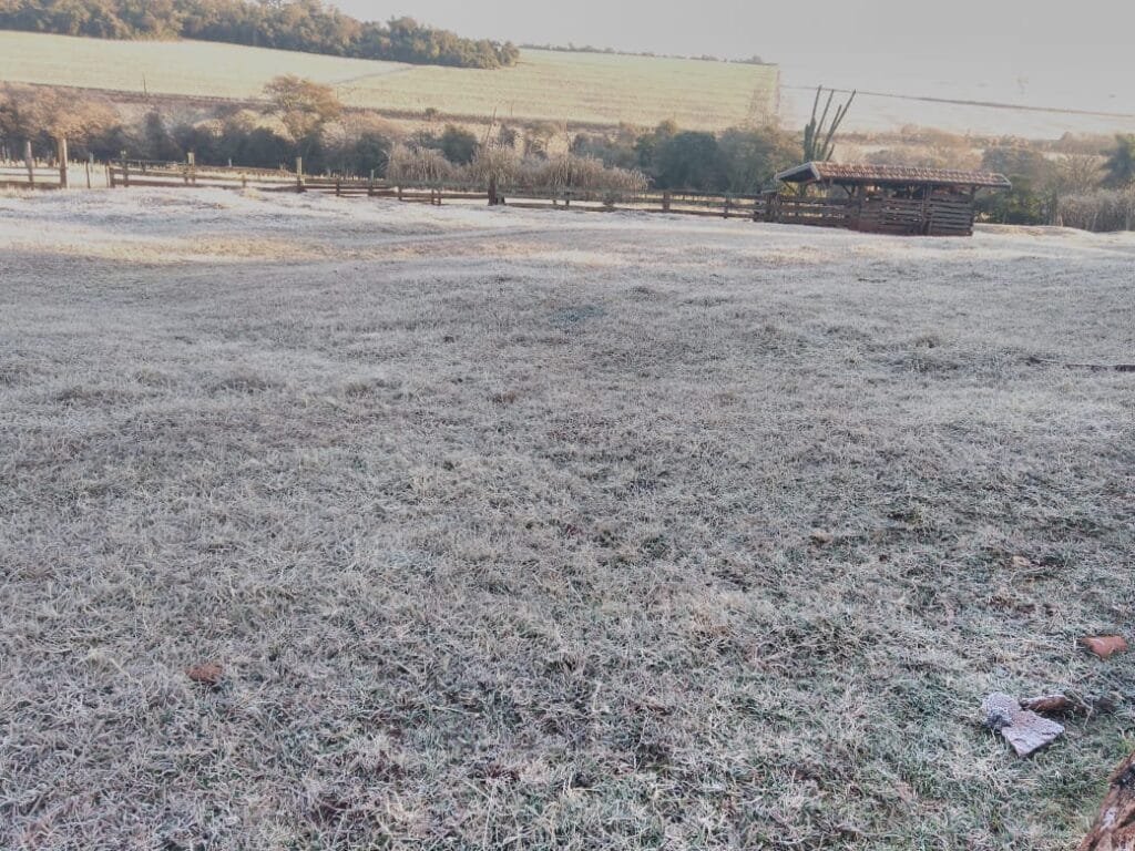 Em uma chácara próxima da cidade, termômetro registrou temperatura abaixo de 0° C. Em propriedade rural da Água da Fartura, bebedouro de animais ficou com lâmina de gelo na superfície.