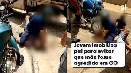 Um jovem de 21 anos teve que imobilizar o pai, de 55, para evitar que ele agredisse a ex-esposa, mãe do rapaz, em Anápolis, a 55 km de Goiânia. Fotos feitas no local mostram o filho ajoelhado sobre o investigado, pressionando um dos braços dele contra o chão para que não pudesse se levantar.
