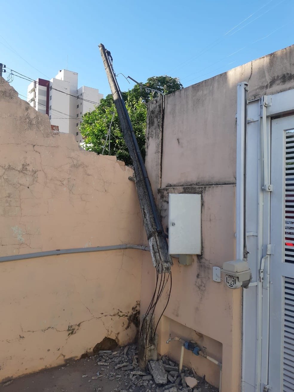 Veículo passou pela Avenida da República e os fios da estrutura ficaram presos. Poste ficava na parte interna de imóvel e ao ser derrubado quebrou parte do muro.