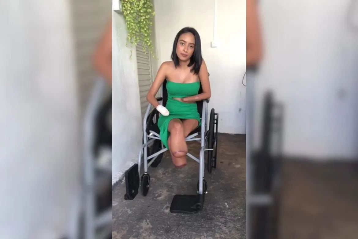 Foto colorida de jovem em cadeira de rodas vestida de verde com os pés e mãos amputados por causa de infecção