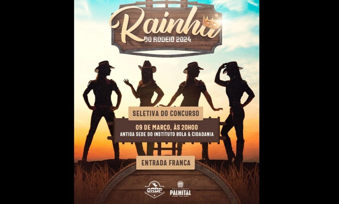 A Comissão de Rodeio os Boiadeiros de Palmital (CRBP) realiza neste sábado (09/03) a seletiva do concurso Rainha do Rodeio 2024. O evento é organizado por meio da parceria com a Prefeitura e patrocinadores, com o objetivo de escolher as representantes da beleza feminina palmitalense na 30ª edição da Festa do Peão Boiadeiro, que será realizada entre 18 e 21 de abril no recinto José Leandro Sobrinho.