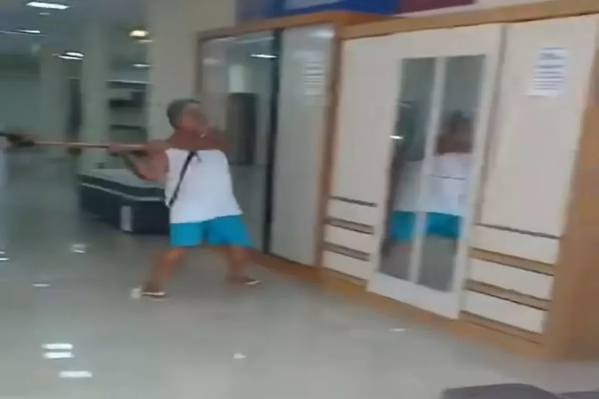 Na quinta-feira (11/04), em Rio das Ostras (RJ), um homem enfurecido destruiu vários móveis em uma loja utilizando um machado.