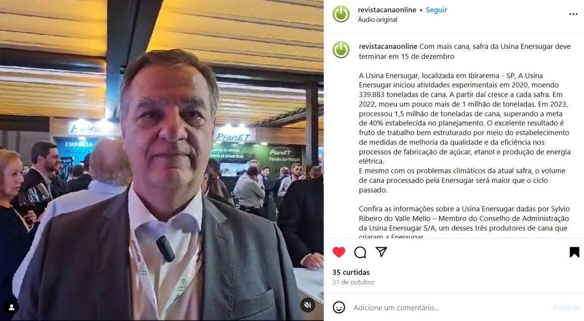 Em entrevista à jornalista Luciana Paiva, que foi ao ar no Instagram da CanaOnline na quinta-feira da semana passada (31 de outubro), Sylvio Ribeiro destacou a evolução do trabalho da Enersugar e ressaltou que, na atual safra, os trabalhos devem se estender até meados de dezembro, dependendo do regime de chuvas. O sócio também enfatizou o bom resultado na moagem de cana-de-açúcar, que em uma fase inicial de colheita apresentou rendimento 12% superior ao previsto – na atual fase, está em 4%.
