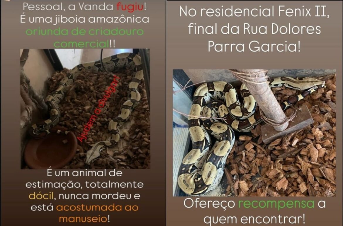 Um morador do bairro Fênix II usou as redes sociais nesta sexta-feira (27/06) para anunciar o desaparecimento de sua jiboia de estimação no bairro Fênix II.