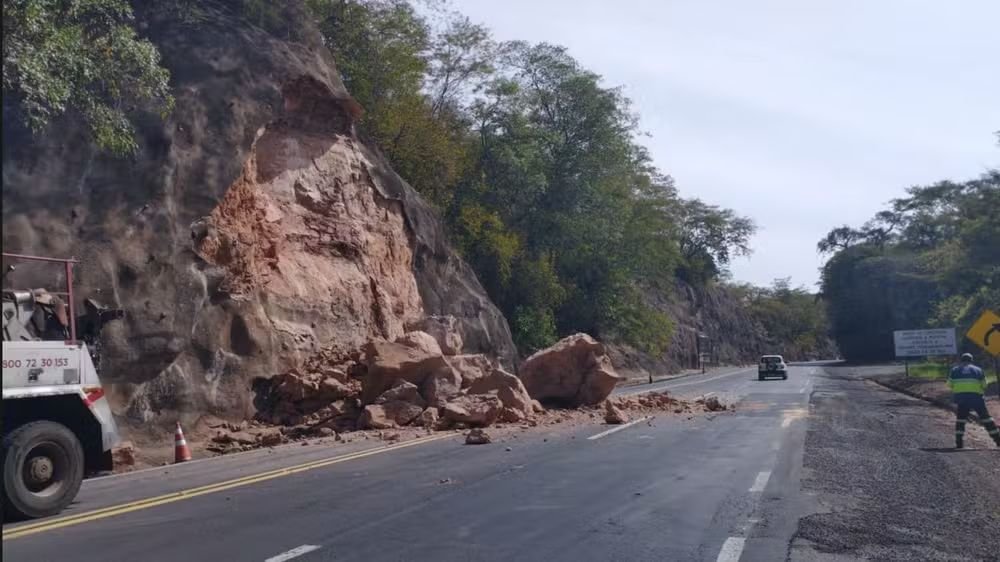 O trecho segue parcialmente interditado, com tráfego controlado por sinalização, desvio pelo acostamento e, em alguns momentos, sistema “pare e siga”.