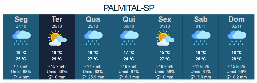Após um período de tempo seco e um fim de semana de calor intenso, Palmital registrou uma mudança significativa nas condições climáticas a partir da noite de domingo (27/10), com o retorno das chuvas que devem predominar ao longo da semana. A chegada de uma frente fria ao Estado de São Paulo trouxe maior nebulosidade e queda nas temperaturas, segundo a previsão meteorológica.
