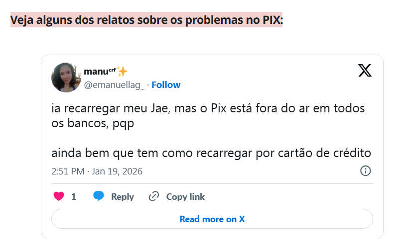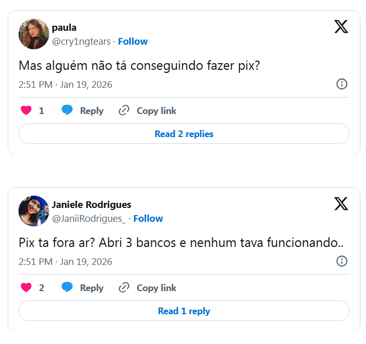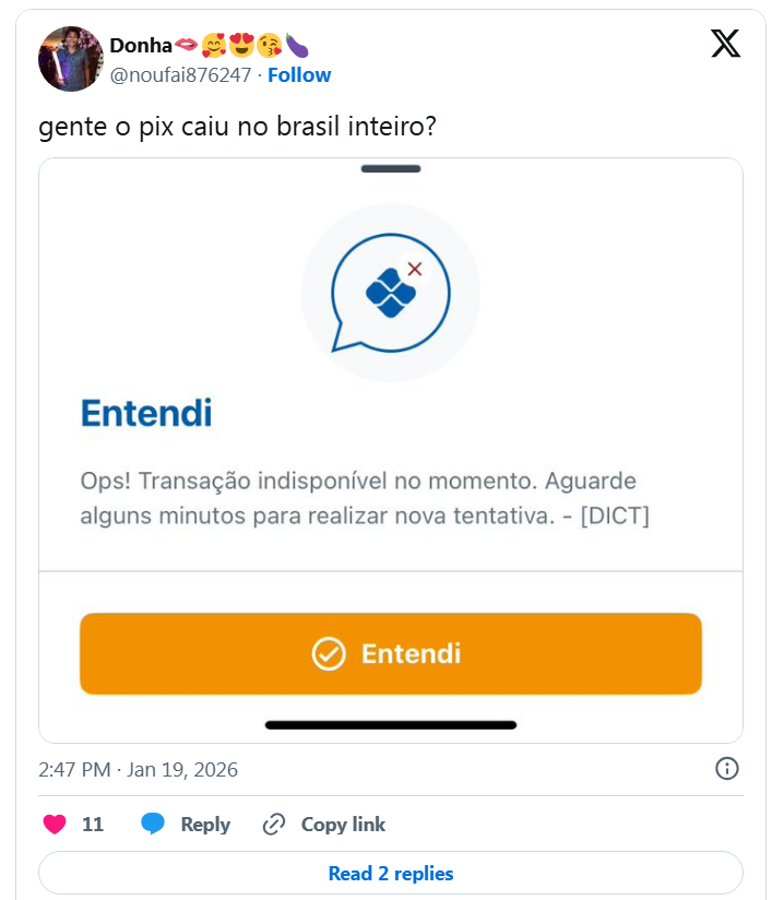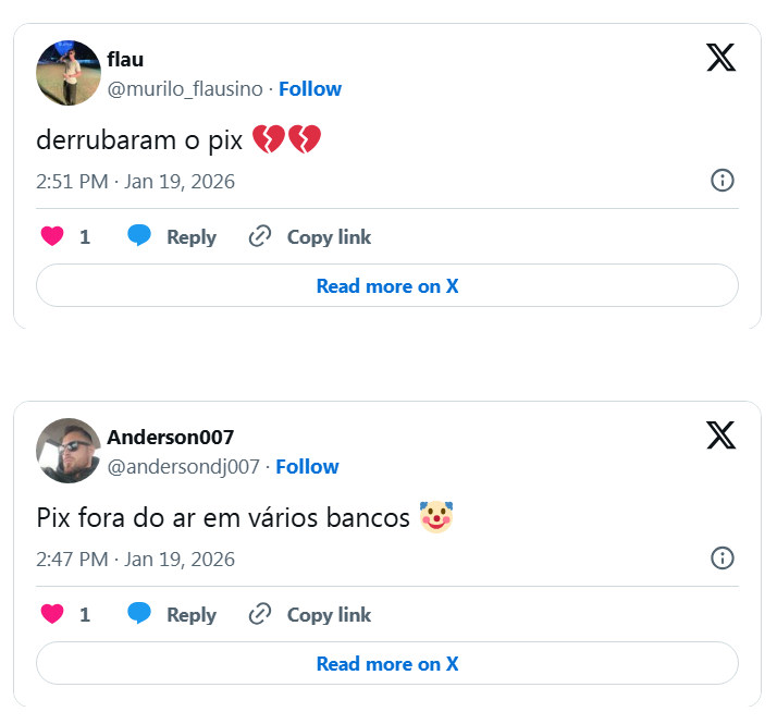 O site também apontou aumento nas reclamações em pelo menos oito bancos, sugerindo que a falha está no sistema do Banco Central, e não em uma instituição específica. Entre os bancos que já tinham registrado reclamações, estavam: