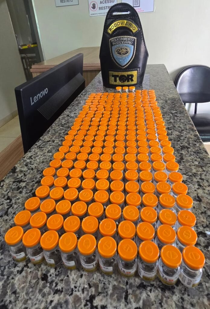 Durante a vistoria no interior do veículo, os agentes localizaram 246 ampolas de Tirzepatida (Mounjaro) e 20 frascos de perfume escondidos dentro de duas almofadas de pescoço pertencentes à passageira da poltrona 27. No bagageiro, também foi encontrada uma grande quantidade de mercadorias oriundas do Paraguai, sem documentação fiscal.