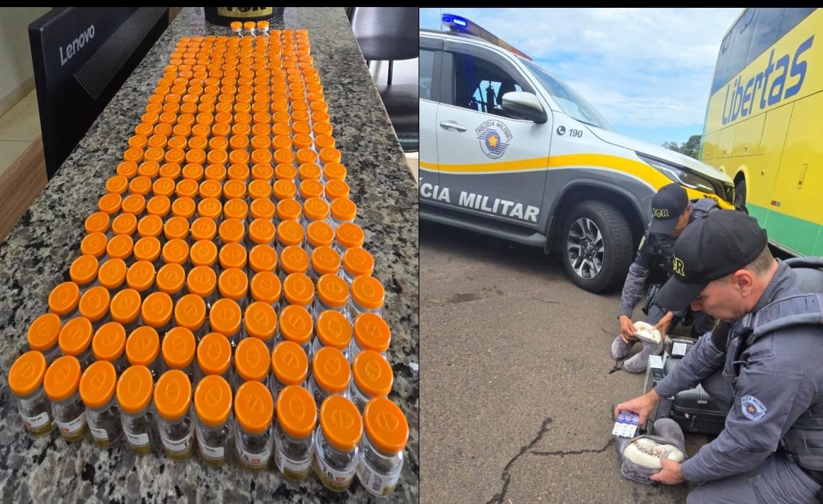 Durante a vistoria no interior do veículo, os agentes localizaram 246 ampolas de Tirzepatida (Mounjaro) e 20 frascos de perfume escondidos dentro de duas almofadas de pescoço pertencentes à passageira da poltrona 27. No bagageiro, também foi encontrada uma grande quantidade de mercadorias oriundas do Paraguai, sem documentação fiscal.