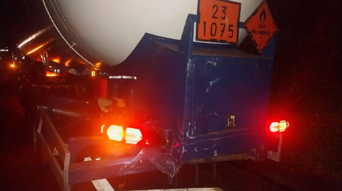 A carreta atingida transportava gás inflamável, mas não houve registro de vazamento. Após a a batida, ambos os veículos foram imobilizados no acostamento da rodovia. Apesar do impacto e do tipo de carga transportada, ninguém ficou ferido.