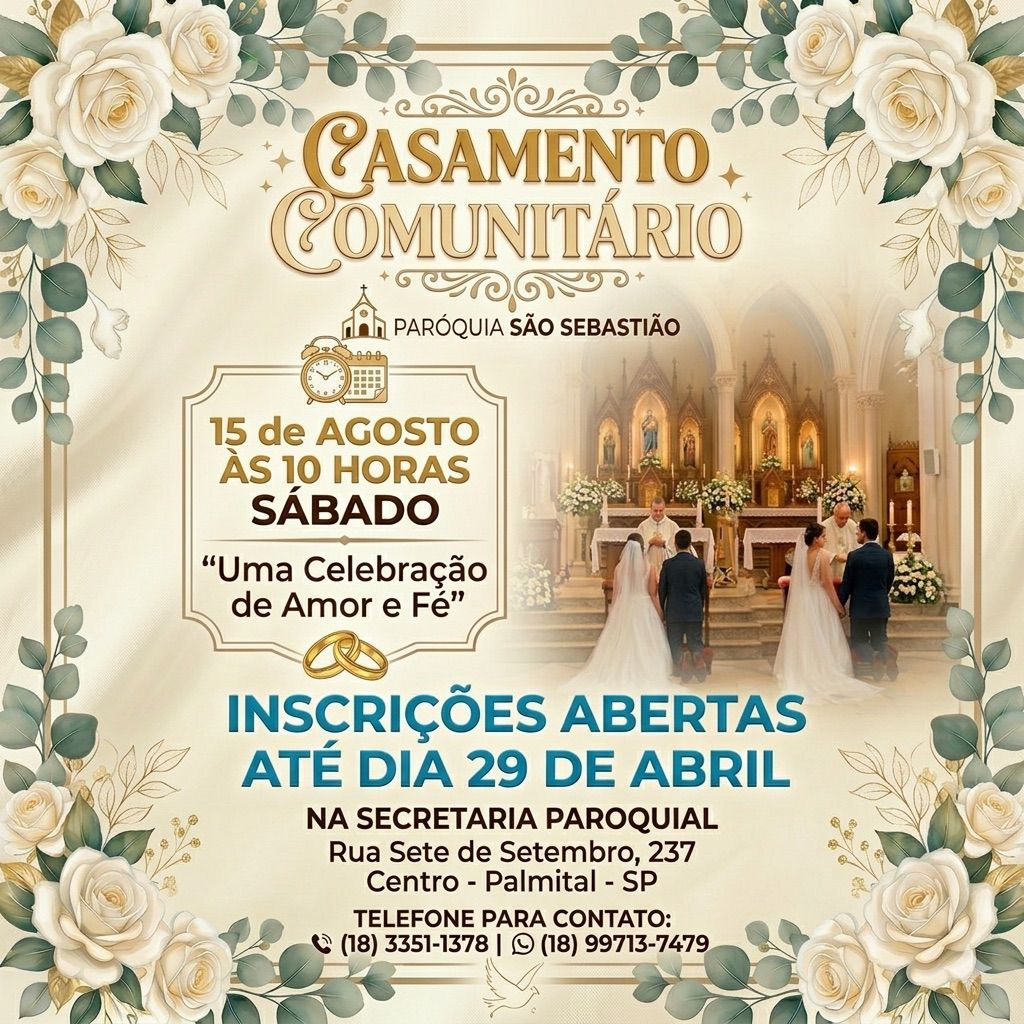 A Paróquia São Sebastião está organizando um Casamento Comunitário com o objetivo de oficializar, perante Deus, a união de casais que já vivem em união estável. Com o lema “Onde houver amor, que Deus o abençoe”, o evento busca fortalecer os laços matrimoniais e reafirmar a importância da fé como base da vida familiar. As inscrições estão abertas até o dia 29 de abril.