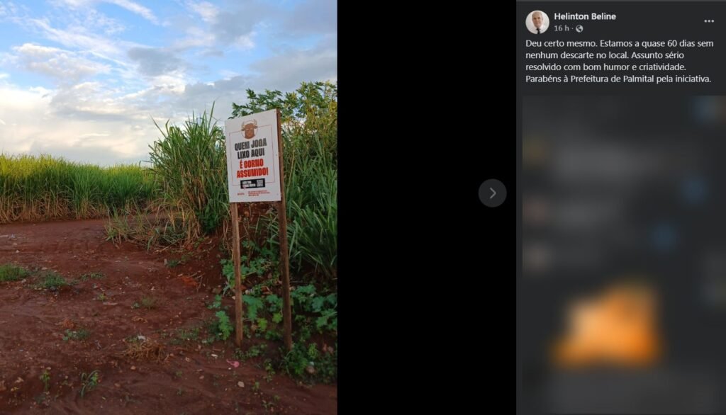 “Deu certo mesmo. Estamos há quase 60 dias sem nenhum descarte no local. Assunto sério resolvido com bom humor e criatividade. Parabéns à Prefeitura de Palmital pela iniciativa”, comentou Helinton Beline na postagem publicada no Facebook no final da tarde de terça-feira (07/04), junto à foto do local em que a placa foi instalada. Devido ao ineditismo e à criatividade, a campanha lançada pelo prefeito Luis Gustavo teve grande repercussão e ganhou destaque na mídia nacional.