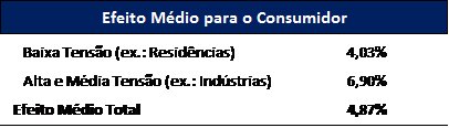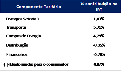 Na tabela a seguir, pode-se observar que o grande peso desse reajuste foi a compra da energia proveniente de Itaipu, com 5,71%, em razão da homologação pela ANEEL das novas tarifas de uso do sistema da transmissão (TUST) para o próximo ciclo. O custo com a compra de energia também teve uma parcela representativa na composição, com um índice de 4,79%. Já a parcela que cabe a distribuidora foi negativa, ou seja, a empresa deixará de receber 0,35%, que se deve a inflação acumulada nos últimos 12 meses e ao compartilhamento dos ganhos de eficiência da empresa com os consumidores.