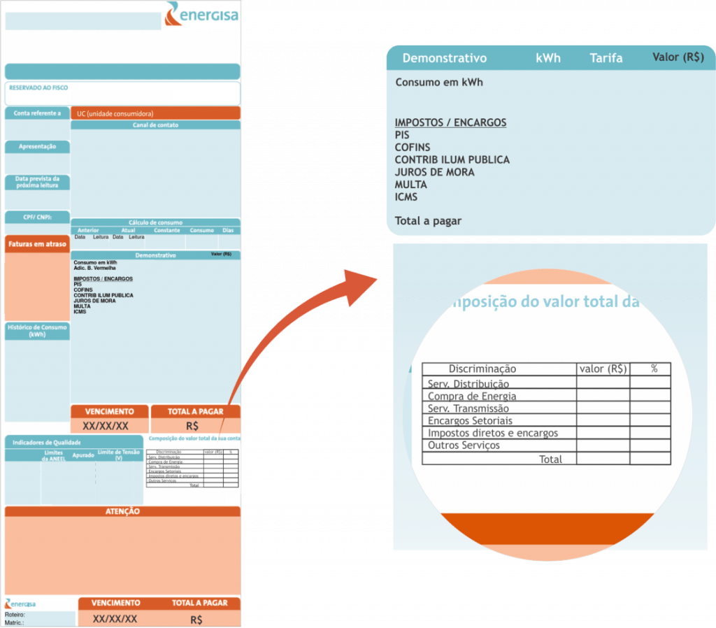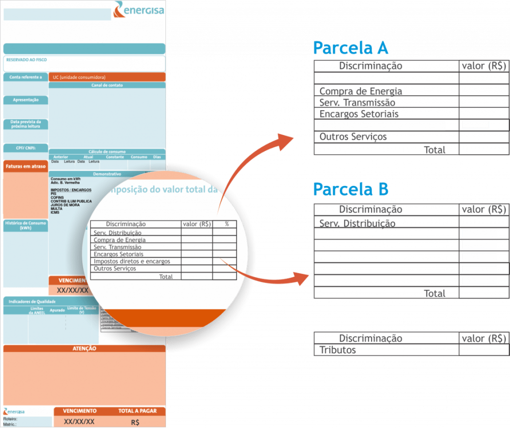 Veja na conta de luz abaixo a composição da tarifa e a distribuição de valores entre parcelas A e B: