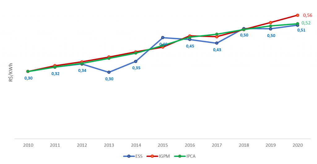 Um dado relevante é que o reajuste da tarifa manteve-se abaixo dos índices que medem a inflação, conforme demostra o gráfico abaixo.