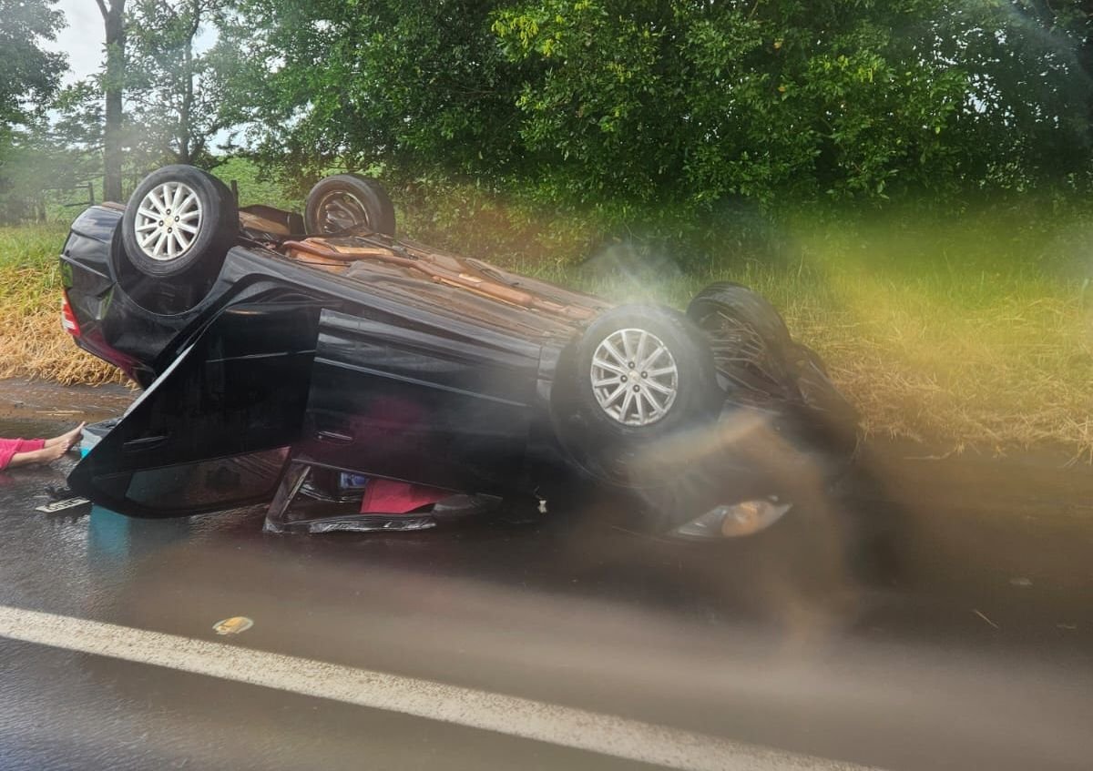 Carro com dois adultos e três crianças capota sob chuva forte em rodovia de Santa Cruz do Rio Pardo