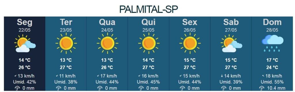 A previsão do IPMet/Unesp, que mantém unidades em Bauru e Presidente Prudente, é de que haja mais frio no final de semana em Palmital, que deve ter temperatura mínima de 7° C. Apesar disto,não há alerta para geadas. O céu volta a ficar ensolarado no domingo (18/06), que terá máxima de 19° C. As temperaturas deverão entrar em elevação a partir de segunda-feira (19/06).