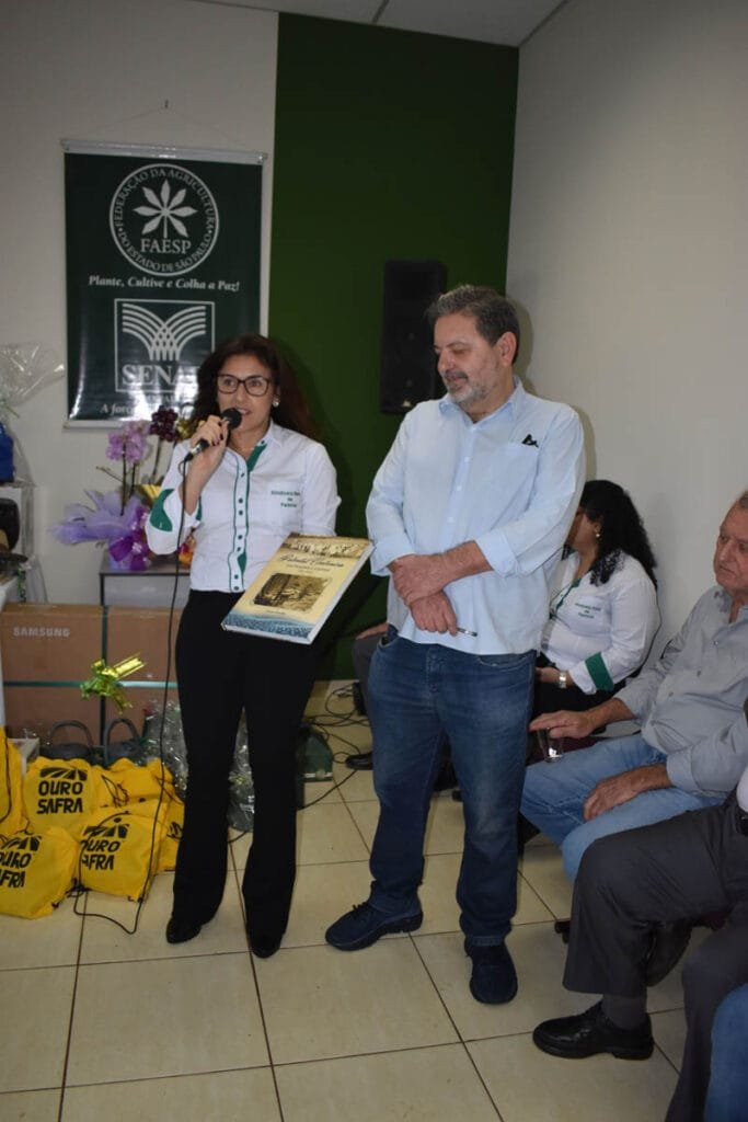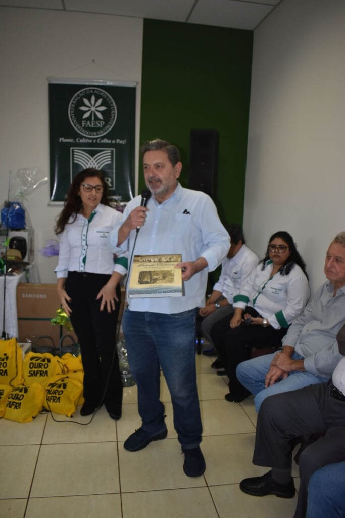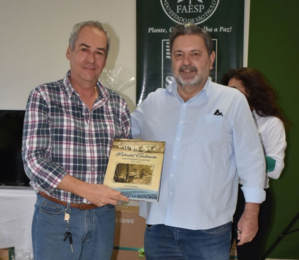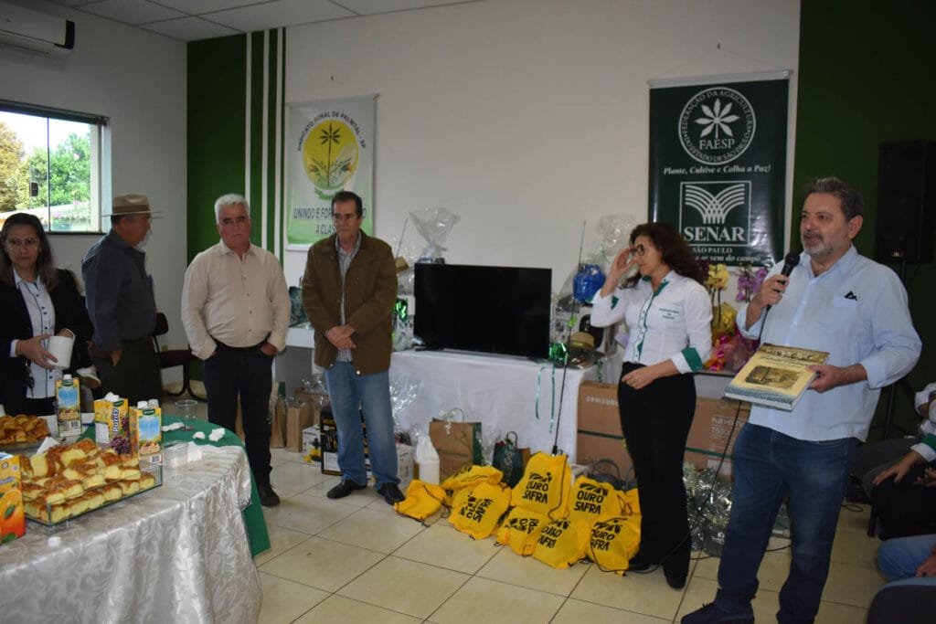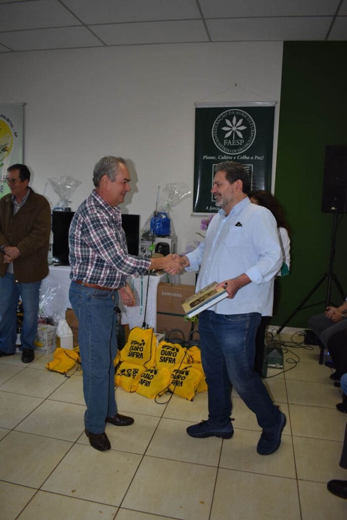 Um dos brindes sorteados durante a comemoração no Sindicato Rural foi o livro “Palmital Centenária – Dos picadões à internet – 1920-2020”. O autor, o jornalista e diretor do JC Cláudio Pissolito, destacou que a obra também inclui a história da agricultura do município e autografou o exemplar entregue ao ganhador Milton Pamplona Pyles.