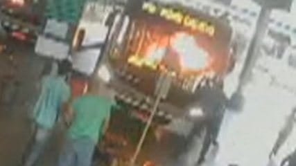 As câmeras de segurança registraram quando, na quarta-feira (1º), a mulher se aproxima do ônibus, que estava parado dentro do terminal. Em seguida, ela joga etanol na cabine e coloca fogo. Depois, há uma explosão e o motorista fica com o corpo em chamas. O vídeo mostra o desespero de passageiros.