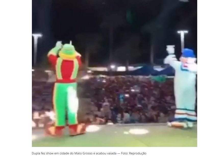 Os palhaços Patati Patatá foram vaiados depois de subirem ao palco, sem banda, e cantarem apenas quatro músicas, em um evento em Guarantã do Norte (MT), em comemoração ao aniversário de 41 anos da cidade, no sábado .