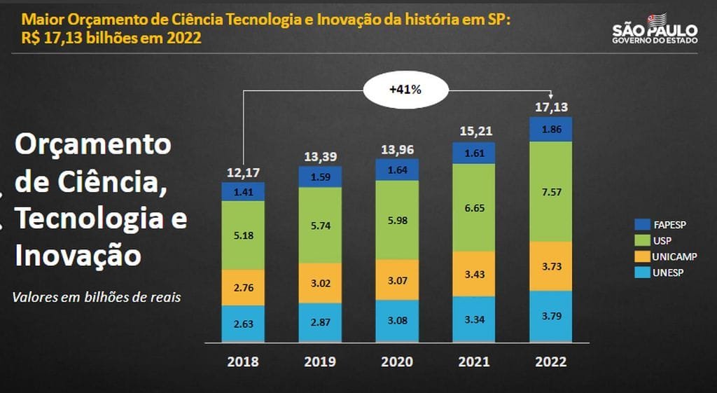 Em relação ao orçamento previsto para as universidades estaduais em 2018, o aumento geral para o próximo ano é da ordem de 41%. Com o investimento recorde em ciência, tecnologia e inovação, o Governo do Estado garante que as instituições tenham retorno seguro às aulas presenciais em 2022 e investimento em infraestrutura física e tecnológica.