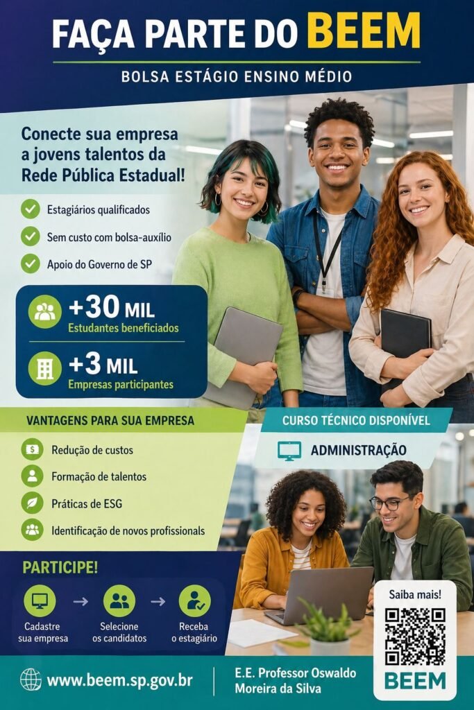 Por meio do programa Bolsa Estágio Ensino Médio (Beem), do governo do Estado de São Paulo, empresas de Palmital têm a oportunidade para investir em talentos locais sem custos com bolsa-estágio. A iniciativa permite que organizações acolham estudantes de cursos técnicos de administração da escola Oswaldo Moreira durante seis meses, incentivando a inserção dos jovens no mercado de trabalho e fortalecendo o desenvolvimento econômico do município.