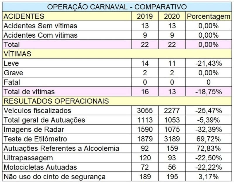 Assim como em 2019, não houve morte decorrente de acidentes automobilísticos em rodovias do Oeste Paulista no Carnaval de 2020. O número de acidentes se manteve o mesmo, com 22 ocorrências em cada ano, mas a quantidade de vítimas feridas diminuiu 18,75%, passando de 16 para 13.