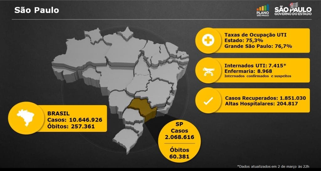 “Os leitos serão ativados gradualmente a partir do dia 8 de março para reforçar o sistema público de saúde no Estado. Lembrando, vamos enfrentar nas duas próximas semanas as duas piores semanas da pandemia no Brasil desde março do ano passado”, disse Doria.