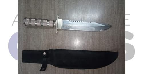 Com as características do suspeito, que já era conhecido dos meios policiais, a equipe iniciou patrulhamento. O suspeito foi avistado na calçada de um estabelecimento comercial. Ao perceber a viatura, ele entrou no comércio e dispensou uma faca, ainda embainhada (na bainha), atrás do balcão.