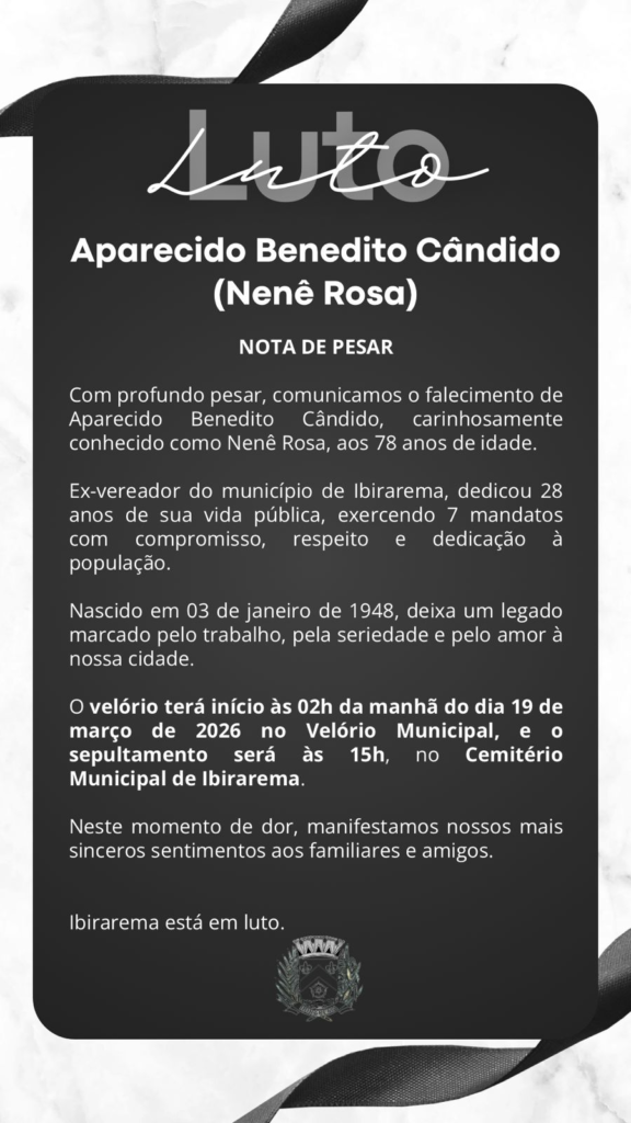 A cidade de Ibirarema amanheceu em luto nesta quinta-feira (19/03) com a notícia do falecimento do agricultor Aparecido Benedito Cândido, conhecido carinhosamente como Nenê Rosa, aos 78 anos. Ex-vereador e atuante na política municipal, ele dedicou quase três décadas à vida pública, exercendo sete mandatos consecutivos na Câmara Municipal.