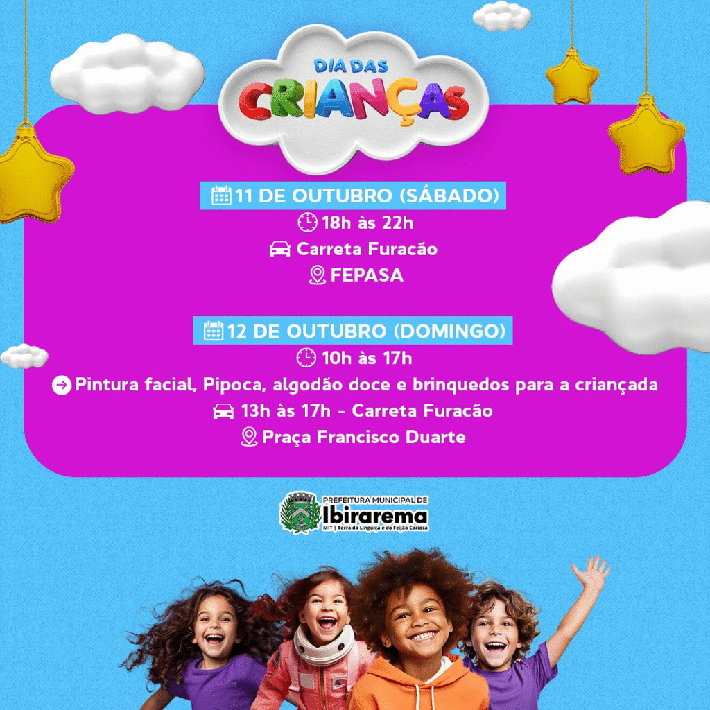 A Prefeitura de Ibirarema realiza neste final de semana uma programação especial do Dia das Crianças. Para garantir a diversão da garotada, a carreta da alegria estará fazendo passeios gratuitos na noite deste sábado (11/10) e na tarde de domingo (12/10).