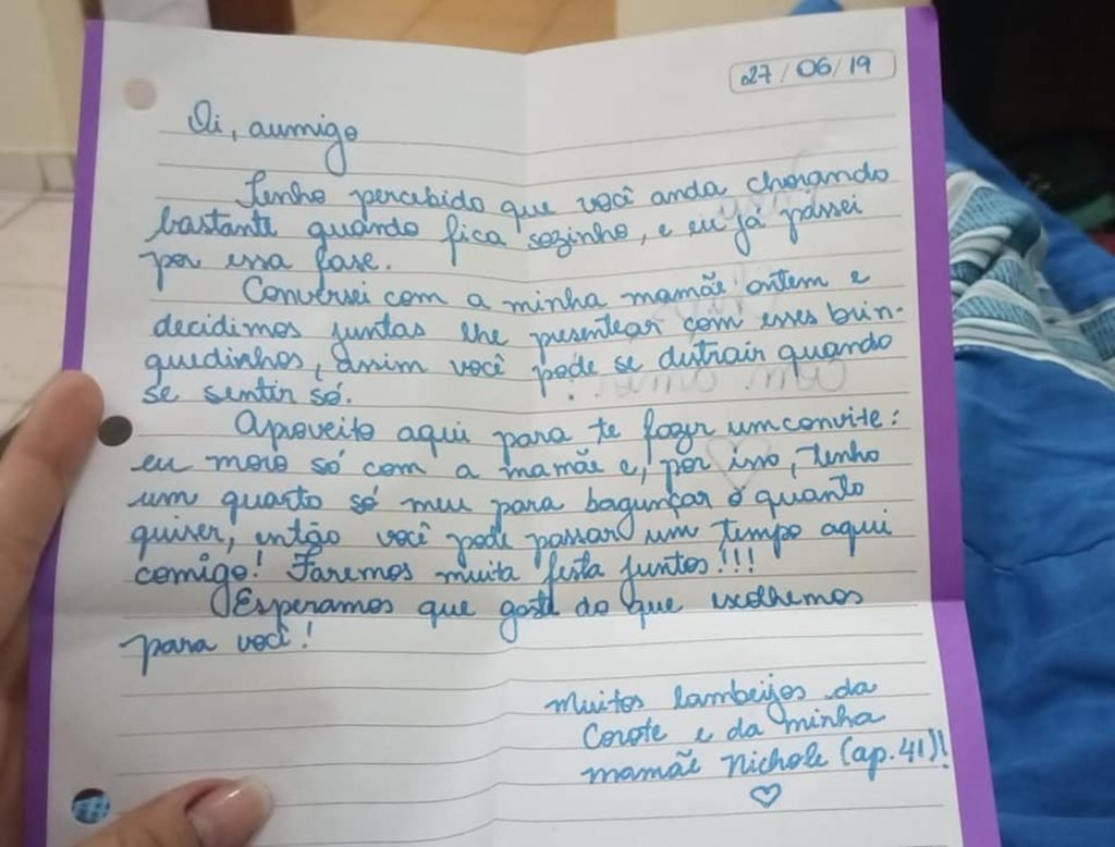 Um dos colegas de apartamento de Maria Luiza viu o pacote ao chegar ao apartamento e entregou para ela, que ficou emocionada. “Eu até chorei. Fiquei em choque. Achei a atitude muito bonita. Tem gente que reclama e não pergunta se o outro precisa de ajuda. Foi surpreendente”, diz.