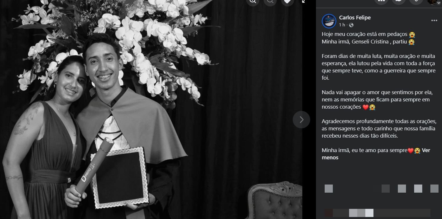“Hoje meu coração está em pedaços 😭 Minha irmã, Genseli Cristina, partiu 😭 Foram dias de muita luta, muita oração e muita esperança. Ela lutou pela vida com toda a força que sempre teve, como a guerreira que sempre foi. Nada vai apagar o amor que sentimos por ela, nem as memórias que ficam para sempre em nossos corações ❤️😭 Agradecemos profundamente todas as orações, as mensagens e todo carinho que nossa família recebeu nesses dias tão difíceis. Minha irmã, eu te amo para sempre ❤️😭”