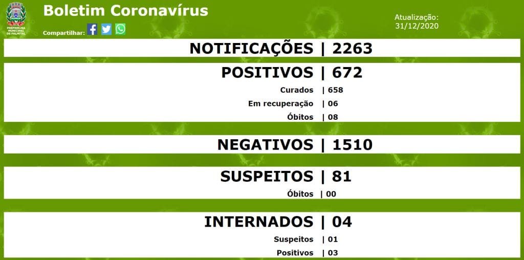Conforme dados da Secretaria de Saúde, o boletim de 1º de dezembro mostrava 581 casos confirmados. No último dia do ano, o total de infectados foi de 672, com 658 curados e 6 pacientes em recuperação, sendo 3 internados e o restante em isolamento domiciliar.