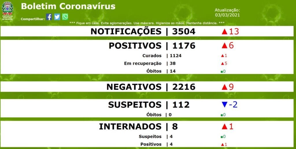 O Boletim Epidemiológico divulgado pela Prefeitura nesta quarta-feira (03/03) mostrou que há 1.176 pacientes confirmados, sendo 1.124 curados, não transmitindo mais a doença, e 38 em recuperação. O número de óbitos se manteve em 14. A Secretaria de Saúde informou 112 pacientes em situação suspeita para a doença, que aguardavam exames para comprovar ou descartar a infecção.