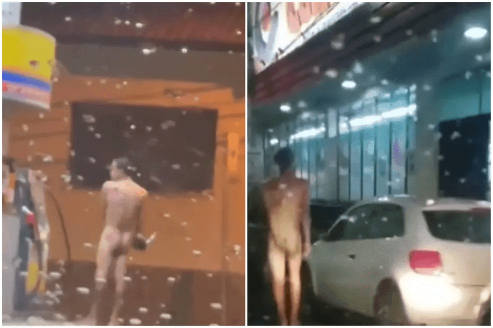 Um vídeo divulgado nas redes sociais mostra o rapaz sem roupas no posto, ele pega a mangueira da bomba de combustível quando espalha o líquido pelo comércio, que fica na Rua João Passos. Depois, ele sai do local. (confira o vídeo mais abaixo – somente quem estiver logado consegue ver)
