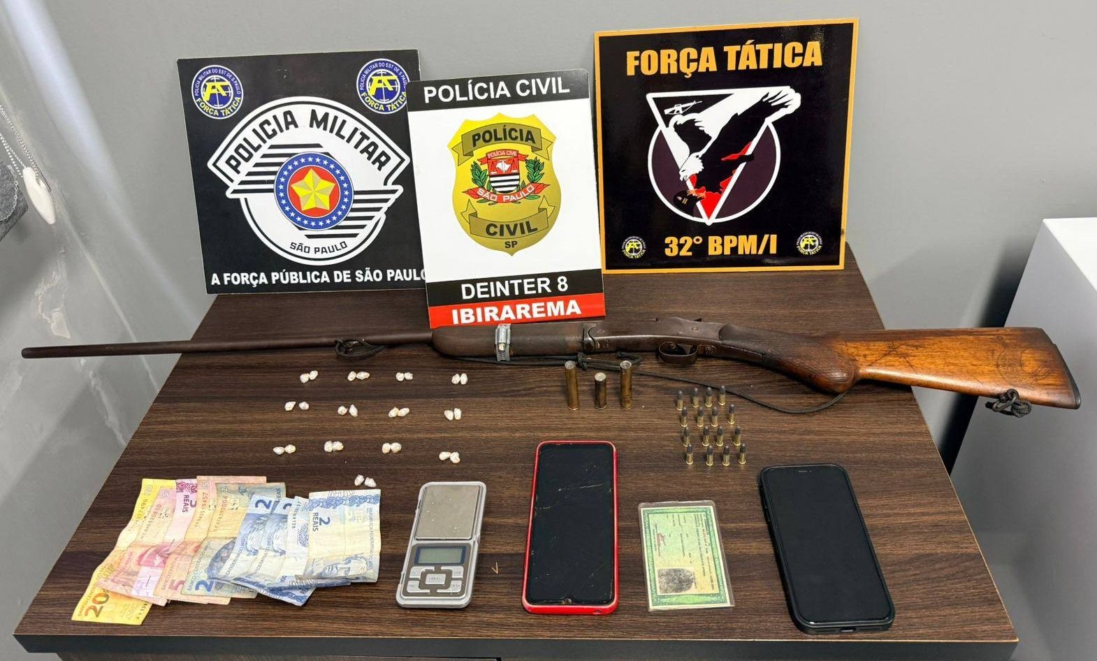 Foram apreendidos uma espingarda calibre 36, munições, porções de cocaína, maconha e crack, além de balanças de precisão, aparelhos eletrônicos e dinheiro em espécie. Os presos são três homens, de 31 e 26 anos, e duas mulheres, de 28 e 27 anos.