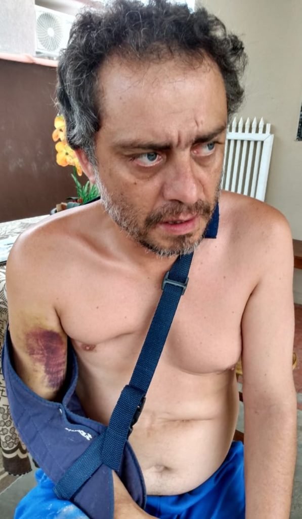 “Ele acertou chutes na cabeça que abriram um corte no meu queixo, e também acabou quebrando meu braço, o ombro e duas costelas. Só parou quando as pessoas começaram a intervir, aí entrou no carro dele e fugiu quando chamaram a Polícia Militar. Vou ficar pelo menos dois meses sem poder trabalhar nessa situação”, relata o servidor.