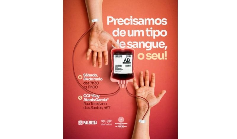Neste sábado, 24 de maio, das 7h30 às 11h, ocorre uma Campanha de Doação de Sangue em Palmital. Os doadores são recebidos no CCI Eloy Atanis Garcia, no Bairro Paraná.