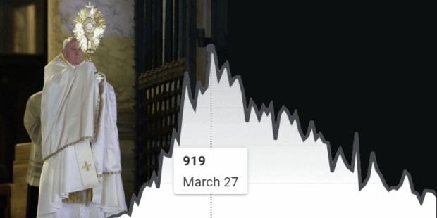 Gráfico postado por padre dos EUA indica 27 de março como um ponto de virada no número de mortes na Itália: foi a inesquecível tarde chuvosa da bênção Urbi et Orbi na Praça vazia